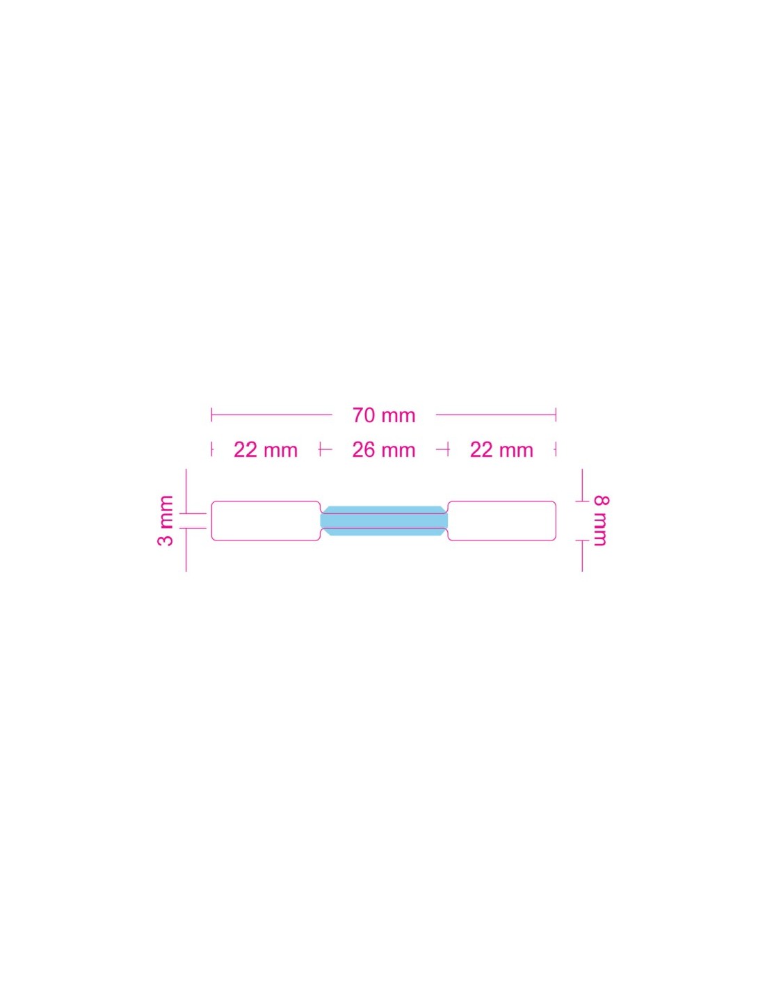 70 x 8 mm (ancho x alto)Zona imprimible 22+22 mmLa parte coloreada en azul del boceto NO LLEVA ADHESIVO, de esta forma se protege el material a etiquetar asegurando un acabado profesional. |