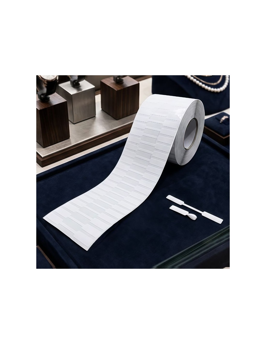 Etiquetas adhesivas para JOYERIA, rollo 4.000 etiq. - 70 x 8 mm con RESERVA DE ADHESIVO